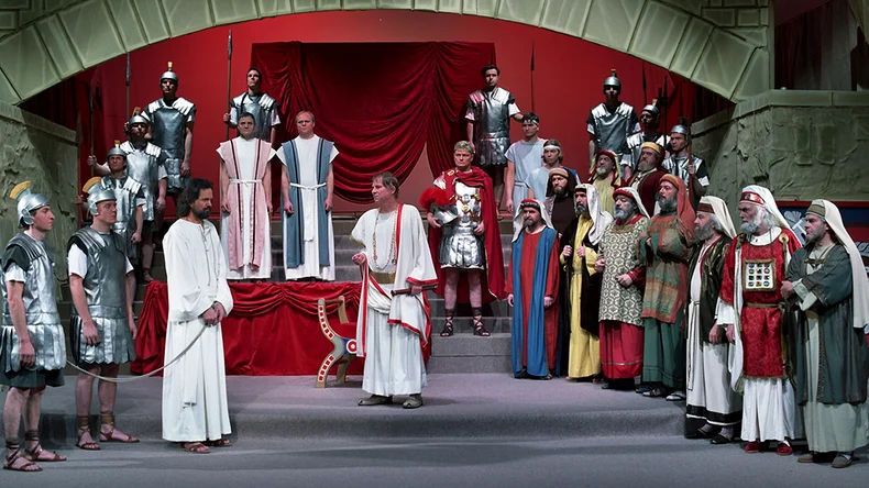 Eine völlig neue Form erhielt der Prolog, der jeden einzelnen Zuschauer an das „Spiel des Lebens" gemahnte, „in dem ein jeder Mensch seine Rolle so annehmen und spielen sollte, wie Gott sie ihm zugedacht hat."" Neu eingeführt wurde von Hirn das 13. Bild „Jesus bei Herodes", eine lebendige Spielszene, die den bisherigen „Prolog" von Max Gläßel, der lediglich eine szenenüberbrückende Funktion hatte, wirkungsvoll ablöste.